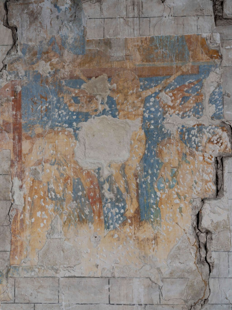 —Crucifixió (mitjans del segle XIV). Aquesta pintura estava darrere del retaule que s’ha retirat per portar-lo a restaurar. S’identifica una escena central amb un Crist crucificat i unes figures als seus costats. Tot i que en alguns punts la pintura està molt erosionada i s’ha perdut el detall, es pot apreciar el dibuix de la cara del Crist i inclús les vetes de la fusta en la policromia de la creu. L’escena correspon segurament al programa pictòric de l’altar del Corpus Christi, de mitjans del segle XIV i d’estil gòtic, i anterior a la construcció de la capella de Santa Escolàstica. L’estat de conservació de les pintures és irregular, condicionat tant per factors ambientals com per la presència de capes superposades, a les quals en alguns punts la policromia restava adherida, fet que n’ha afavorit la inestabilitat i les pèrdues.