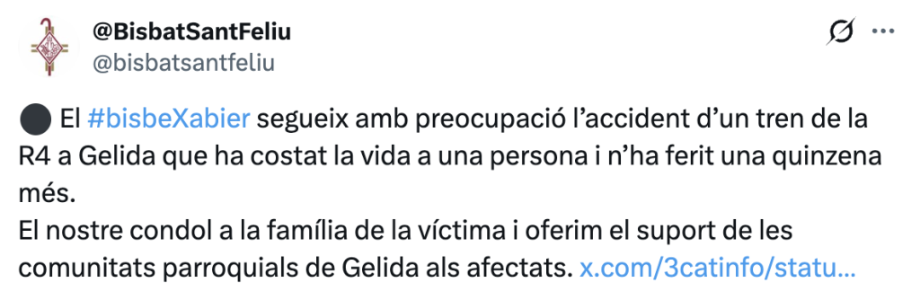 Per la seva banda, tant el bisbe de Sant Feliu de Llobregat (diòcesi a la qual pertany Gelida), Xabier Gómez, com l’arquebisbe de Barcelona, el cardenal Joan Josep Omella, han mostrat també el seu suport i condol a la família de la víctima i als afectats, a través de les xarxes socials: