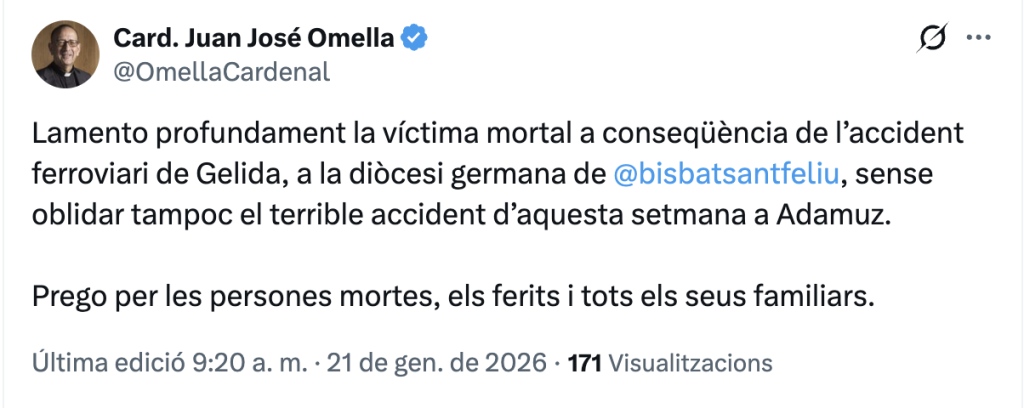 Missatges de condol del bisbe Xabier Gómez i l’arquebisbe de Barcelona, el cardenal Joan Josep Omella